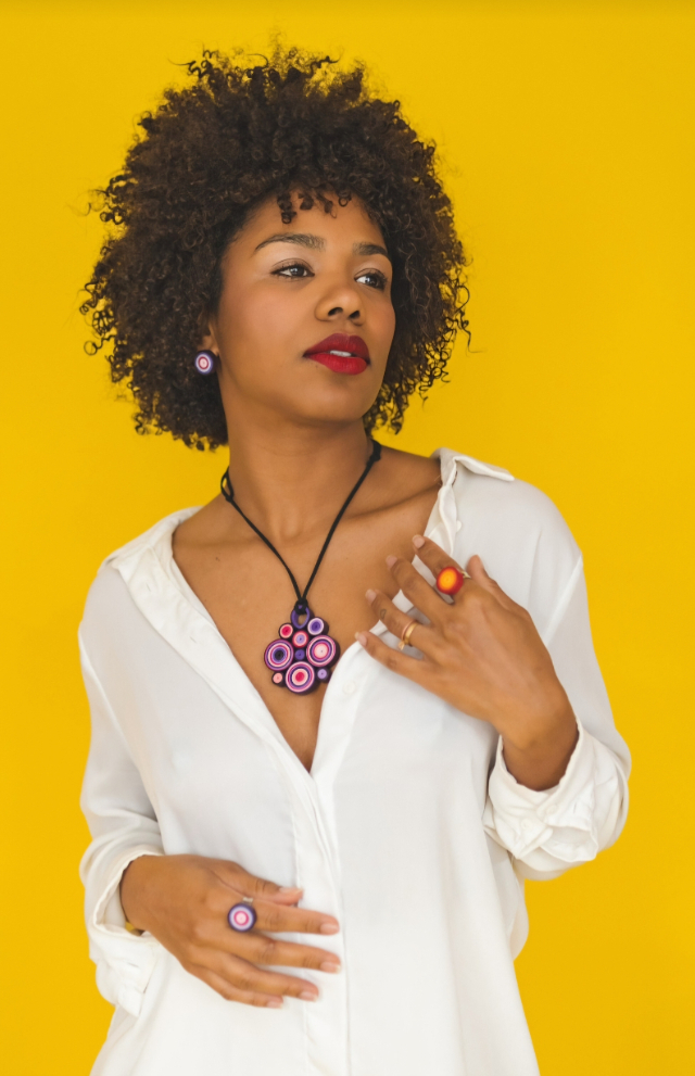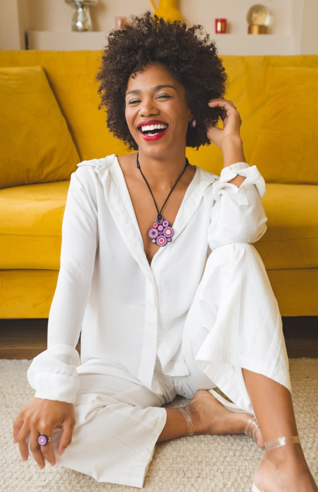 Colar feito à mão, de papel, na técnica quilling.