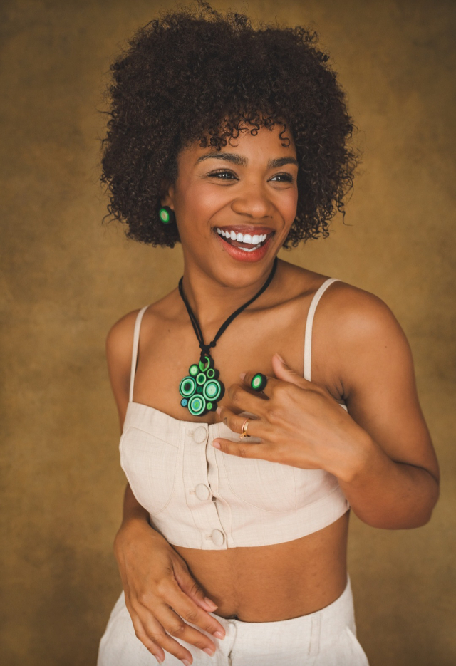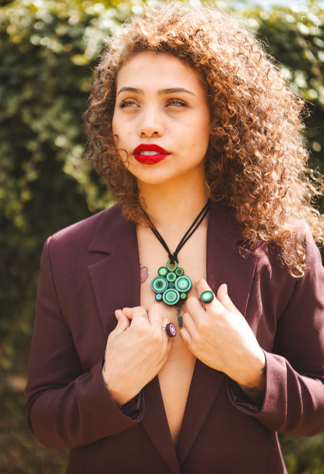 Colar feito à mão, de papel, na técnica quilling.